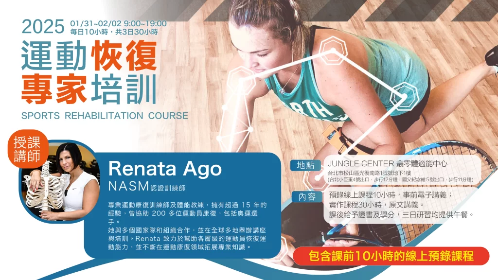 ・運動恢復原則:包括動力鏈、訓練參數、測試方式、矯正方法、筋膜及關節鬆動、神經控制和運動治療。